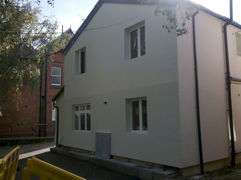 Work Completed: Weber EWI system fixing insulation to existing walls base coat and white top coat with coin detail to corners.